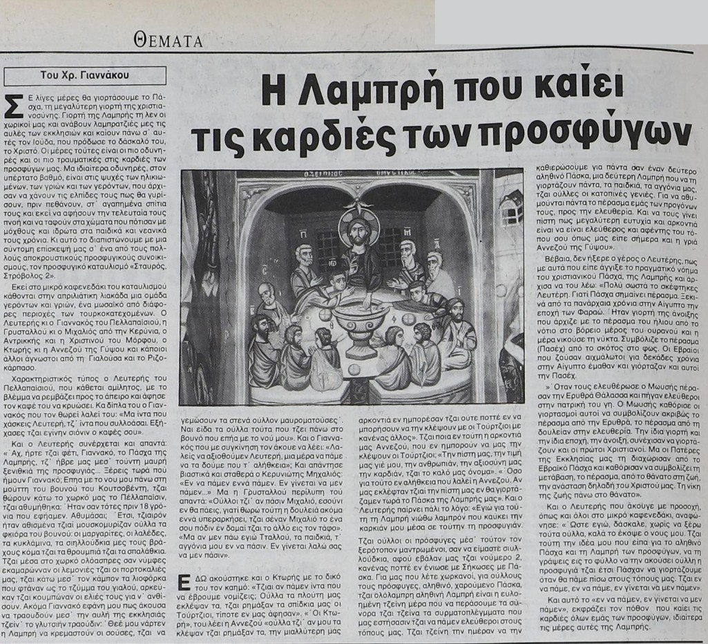 Το απόκομμα αυτό γράφτηκε το 1993 από τον φίλο και πρώην συνάδελφο Χρ. Γιαννάκο. Μόλις 19 χρόνια μετά τον ξεριζωμό του 1974. Δεκαεννέα τα χρόνια από τον πόλεμο, δεκαεννέα και οι ηλικίες εκείνων που τότε ενηλικιώνονταν μέσα στο τραύμα. Οι 19χρονοι του 1974, εκείνοι που έζησαν τον ξεριζωμό στην αρχή της ζωής τους, το 1993 βρίσκονται ήδη στα σαράντα τους. Κουβαλούν ακόμη τη μνήμη ακέραιη, όχι ως αφήγηση αλλά ως συνέχεια της ζωής τους.