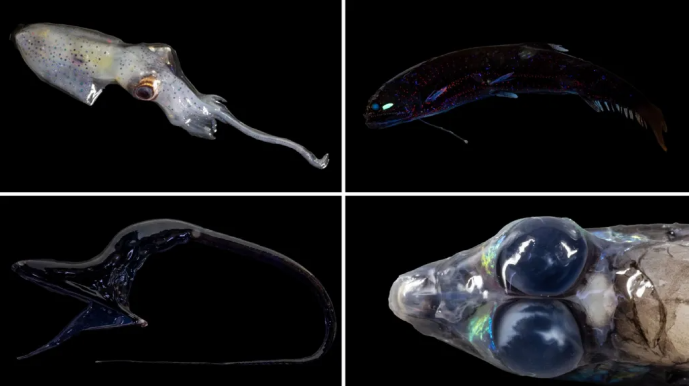 Μεταξύ των εντυπωσιακών οργανισμών που καταγράφηκαν περιλαμβάνονται: χέλι Pelican eel με φωτεινή ροζ ουρά που αναβοσβήνει κόκκινο για να προσελκύει τροφή, το μυστηριώδες ψάρι Barreleye με σωληνοειδή μάτια που κοιτούν προς τα πάνω για να εντοπίζουν τη σκιά της λείας, αλλά και Dragonfish με φωτεινή προεξοχή κάτω από το πηγούνι του.