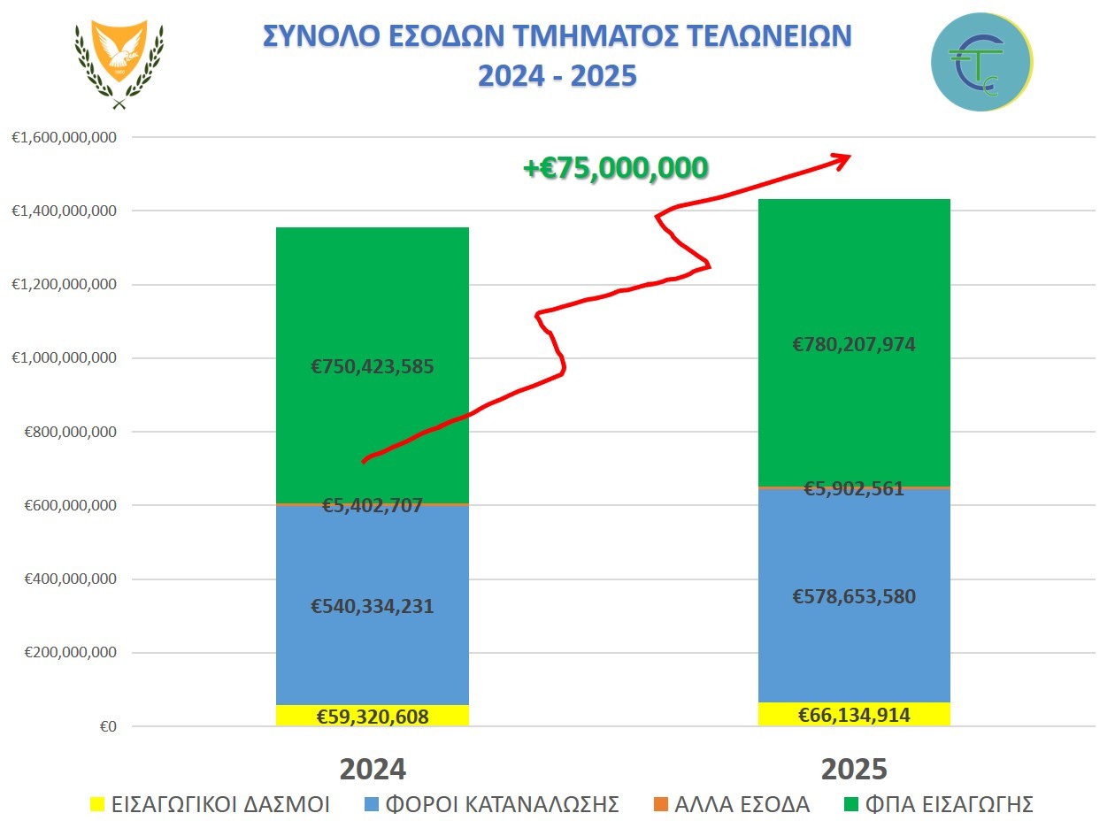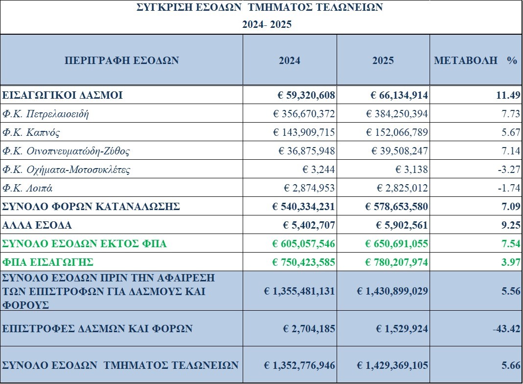 Ειδικότερα, αναφέρει ότι τα έσοδα από εισαγωγικούς δασμούς κατά το έτος 2025 σε σχέση με το έτος 2024 αυξήθηκαν κατά 11,5% (+€6,8 εκ), τα συνολικά έσοδα από το φόρο κατανάλωσης κατά το έτος 2025 σε σχέση με το έτος 2024 αυξήθηκαν κατά 7,1%(+€38,2 εκ), η αύξηση στα άλλα έσοδα ήταν της τάξεως του 9,3%(+€0,5 εκ), ενώ η αύξηση στο Φ.Π.Α. εισαγωγών ήταν της τάξεως του 4%(+€30 εκ).