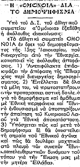 «Το αθλητικό σωματείο ΟΜΟΝΟΙΑ εν όψει του δημοψηφίσματος της 15ης Ιανουαρίου, που διενεργείται από την Εθναρχία, κοινοποιεί τις ακόλουθες αποφάσεις. 1. Ανεπιφύλακτα επιδοκιμάζει την απόφαση της Εθναρχίας περί διενέργειας δημοψηφίσματος. 2. Εντέλλεται δε όλα τα μέλη του, να πρωτοστατήσουν στην προπαρασκευαστική δουλειά για το δημοψήφισμα και ομόθυμα με εθνική περηφάνεια και εθνικό ενθουσιασμό να υποστηρίξουν την απαίτηση του κυπριακού λαού για εθνική αποκατάσταση. 3. Υπόσχεται πως και μετά το δημοψήφισμα δεν θα υποστείλει τη σημαία του εθνικού αγώνα και πως θα δουλέψει μαχητικά στο πλευρό των συνεπών εθνικοαπελευθερωτικών δυνάμεων του τόπου για την Ένωσή μας με την μητέρα Ελλάδα» («Ανεξάρτητος», 12 Ιανουαρίου 1950).