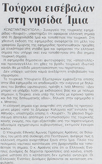 Η ένταση αρχίζει να κορυφώνεται στις 27 Ιανουαρίου 1996, όταν Τούρκοι δημοσιογράφοι της «Χουριέτ» μετέβησαν με ελικόπτερο από τη Σμύρνη στη Μεγάλη Ίμια και υπέστειλαν την ελληνική σημαία και στην θέση της ύψωσαν την τουρκική. Η όλη επιχείρηση βιντεοσκοπείται και προβάλλεται από το τηλεοπτικό κανάλι της Χουριέτ.