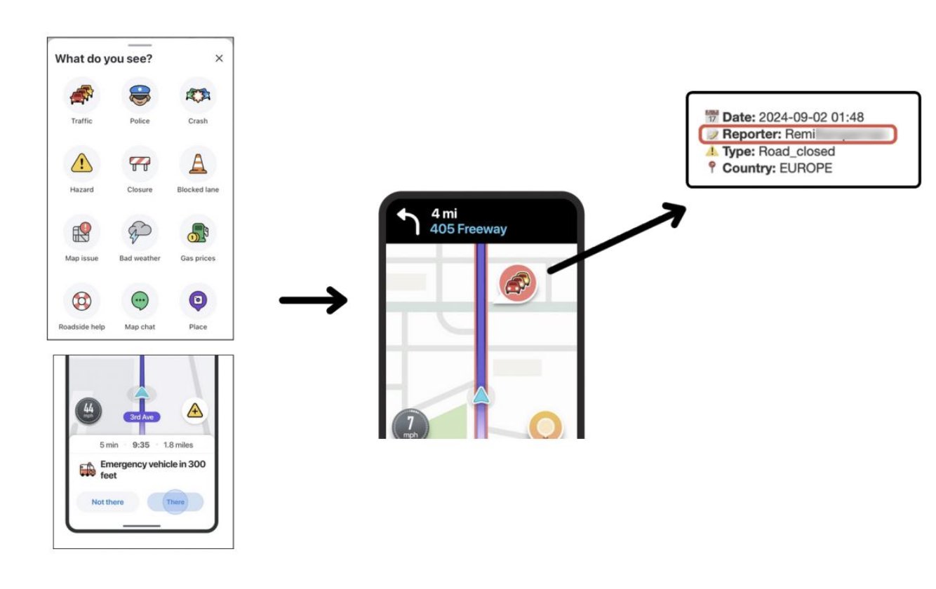 Κάθε φορά που ένας χρήστης υποβάλλει αναφορά –για τροχαία κίνηση, αστυνομικό έλεγχο ή κίνδυνο στον δρόμο, η εφαρμογή καταγράφει και δημοσιοποιεί μέσω του δημόσιου διαδικτυακού χάρτη του Waze ακριβείς συντεταγμένες GPS, χρονική σήμανση μέχρι και το χιλιοστό του δευτερολέπτου και το όνομα χρήστη. Το στοιχείο αυτό δεν αποτελεί τεχνικό σφάλμα ή κενό ασφαλείας, αλλά μέρος του ίδιου του σχεδιασμού της πλατφόρμας.